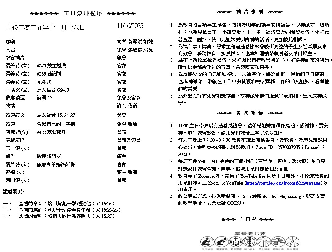 主日崇拜 10:00AM - 11:25 AM  ; 主日学 11:30AM - 12:30PM 青少年 10:00AM - 12:00PM ; 午餐 12:30M - 1:30PM 疫情時期教會的聚會实体和ZOOM网上同步举行, 歡迎新老朋友参加! https://zoom.us/j/2570007935 若有人要跟從我、就當捨己、背起他的十字架、來跟從我。因為凡要救自己生命的、必喪掉生命.凡為我喪掉生命的、必得著生命。人若賺得全世界、賠上自己的生命、有甚麼益處呢.人還能拿甚麼換生命呢。 ~ 馬太福音 16:24-26 ( 馬太福音 16:24-26 )